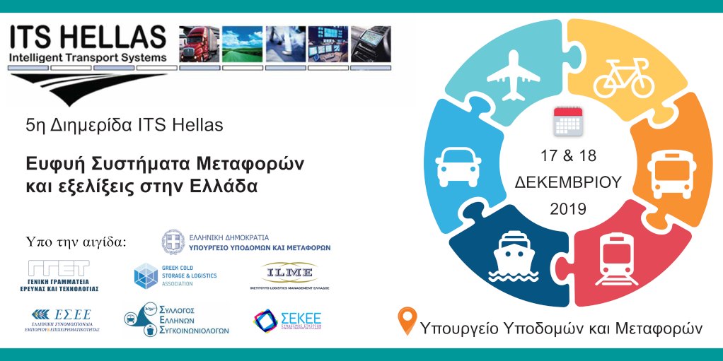 O Ελληνικός Οργανισμός Συστημάτων Ευφυών Μεταφορών – ITS Hellas, σας προσκαλεί στην 5η Διημερίδα με θέμα «Ευφυή Συστήματα Μεταφορών και εξελίξεις στην Ελλάδα», που θα πραγματοποιηθεί την Τρίτη 17 και την Τετάρτη 18 Δεκεμβρίου 2019, στο Κεντρικό Αμφιθέατρο του Υπουργείου Υποδομών και Μεταφορών υπό την αιγίδα του Υπουργείου Υποδομών και Μεταφορών, της Γενικής Γραμματείας Έρευνας και Τεχνολογίας, του Συλλόγου Ελλήνων Συγκοινωνιολόγων, της Ελληνικής Ένωσης Βιομηχανιών Ψύχους & Logistics, της Ελληνικής Συνομοσπονδίας Εμπορίου & Επιχειρηματικότητας, του Συνδέσμου Εταιρειών Κινητών Εφαρμογών Ελλάδας και του Ινστιτούτου Logistics Management Ελλάδος. Η Διημερίδα με θέμα «Ευφυή Συστήματα Μεταφορών και εξελίξεις στην Ελλάδα», διοργανώνεται για 5η φορά και συνιστά πλέον θεσμό για τον ελληνικό κλάδο των Μεταφορών. Στόχος της Διημερίδας είναι να θέσει στο επίκεντρο του διαλόγου το θέμα της ευρείας εφαρμογής των ΕΣΜ στην Ελλάδα, ως μέσο οικονομικής ανάπτυξης και ευημερίας, αλλά και διασφάλισης της αποτελεσματικότητας, της αποδοτικότητας και της ασφάλειας των μεταφορών, προς όφελος τόσο των χρηστών όσο και του περιβάλλοντος.