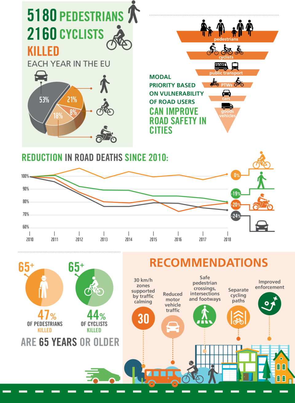 Το ποσοστό των θανάτων ανάμεσα στους πεζούς και τους ποδηλάτες αντιστοιχούσε στο 29% του συνόλου των καταγεγραμμένων θανάτων που σημειώθηκαν στην Ε.Ε. το 2018. Το 99% των θανάτων όσον αφορά στους πεζούς και το 83% των θανάτων όσον αφορά στους ποδηλάτες οφείλονται σε σύγκρουση με μηχανοκίνητο όχημα. Οι ομάδες αυτές, από την άλλη πλευρά, είναι οι λιγότερο πιθανές να βλάψουν άλλους χρήστες του οδικού δικτύου. Η έρευνα αποκάλυψε ότι οι μισοί από όλους τους ποδηλάτες και τους πεζούς που χάνουν τη ζωή τους στους δρόμους της Ε.Ε. είναι άνω των 65 ετών. Οι ηλικιωμένοι είναι πιο ευάλωτοι και λιγότερο ικανοί να ανακάμψουν από σοβαρούς τραυματισμούς. Ωστόσο, ο γηράσκων πληθυσμός της Ευρώπης πρέπει να παραμείνει ενεργός και δραστήριος για λόγους υγείας και ευημερίας. Το ETSC αναφέρει ότι η πρόκληση είναι να βρεθούν οι τρόποι να βελτιωθεί η ασφάλεια κατά το περπάτημα ή την ποδηλασία, ιδιαίτερα για ομάδες υψηλού κινδύνου όπως οι ηλικιωμένοι και τα παιδιά.