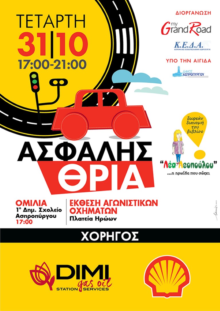 Ο Μη Κερδοσκοπικός Οργανισμός My Grand Road (MGR) σε συνεργασία με την Κοινωφελή Επιχείρηση του Δήμου Ασπροπύργου (ΚΕΔΑ) συνδιοργανώνουν εκδήλωση για την οδική ασφάλεια με την ονομασία ‘’ Ασφαλής Θρία ‘’ την 31η Οκτωβρίου 2018 . Η εκδήλωση αποτελείται από δύο μέρη. Στο πρώτο μέρος θα πραγματοποιηθούν ομιλίες στην αίθουσα του 1ου Δημοτικού Σχολείου Ασπροπύργου σε μέλη του Κέντρου Δημιουργικής Απασχόλησης του Δήμου (ΚΔΑΠ) αλλά και στους συνοδευόμενους γονείς τους με κύριο θέμα την Ασφαλή Οδήγηση και την χρήση της Λωρίδας Έκτακτης Ανάγκης. Σε κάθε συμμετέχων θα δίνεται το εκπαιδευτικό βιβλίο-παραμύθι ‘’ #Λέα_Λεοπούλου, η Ηρωίδα που σώζει ’’. Το δεύτερο μέρος περιλαμβάνει επίσκεψη σε έκθεση αγωνιστικών οχημάτων στην κεντρική πλατεία Ασπροπύργου, όπου κάθε επισκέπτης θα μπορεί να μπει μέσα στο όχημα, να ενημερωθεί για τον εξοπλισμό οδικής ασφάλειας κάθε αγωνιστικού οχήματος , τον ειδικό εξοπλισμό που φορά κάθε οδηγός αγώνων και να ενημερωθεί από τους επαγγελματίες οδηγούς για την σωστή χρήση του αγωνιστικού. Στόχος μας είναι κάθε παιδί και γονιός είναι να ενημερωθούν για το μείζον ζήτημα της οδικής ασφάλειας, να ενημερωθούν για τα οδικά τροχαία ατυχήματα και να μάθουν με ποιους τρόπους Μπορούμε Όλοι Μαζί να μειώσουμε τους Θανάτους στον δρόμο. Αποκλειστικός χορηγός προκειμένου να υλοποιηθεί η εκδήλωση ‘’ Ασφαλής Θρία’’ είναι η εταιρεία DIMI gas oil Ασπρόπυργος.