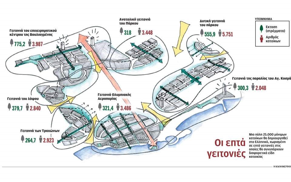 Η Lamda Development θα υλοποιήσει, με τη μορφή στρατηγικών συνεργασιών, τη συντριπτική πλειονότητα των έργων, εξαιρουμένων των δύο malls. Συνολικά, το σχέδιο αξιοποίησης της έκτασης του πρώην αεροδρομίου προβλέπει την υλοποίηση: -10.800 κατοικιών με μέσο μέγεθος 110 τ.μ. στις οποίες περιλαμβάνονται ο πύργος/συγκρότημα κατοικιών και μικτών χρήσεων πλησίον του Μητροπολιτικού Πάρκου και ο πύργος κατοικιών στη μαρίνα -1.000 περίπου δωματίων 3 ξενοδοχείων (στην Λεωφ.Βουλιαγμένης-600 δωμάτια, στην μαρίνα 270 δωμάτια και δίπλα στη θάλασσα). Σε αυτά δεν περιλαμβάνεται το ξενοδοχείο του ολοκληρωμένου τουριστικού συγκροτήματος με καζίνο (IRC). -2 εμπορικά κέντρα -Μουσείων, πολιτιστικών κέντρων, αθλητικών εγκαταστάσεων στα οποία περιλαμβάνεται ένα πολυδύναμο κέντρο πολλαπλών λειτουργιών και εκδηλώσεων με πύργο παρατήρησης, που αποτελεί ψηλό κτίριο ειδικής αρχιτεκτονικής σχεδίασης, ένα ενυδρείο – ερευνητικό κέντρο και ένα ιατρικό κέντρο. -πύργου γραφείων και λοιπών χρήσεων στην Βουλιαγμένης -Μητροπολιτικού πάρκου.