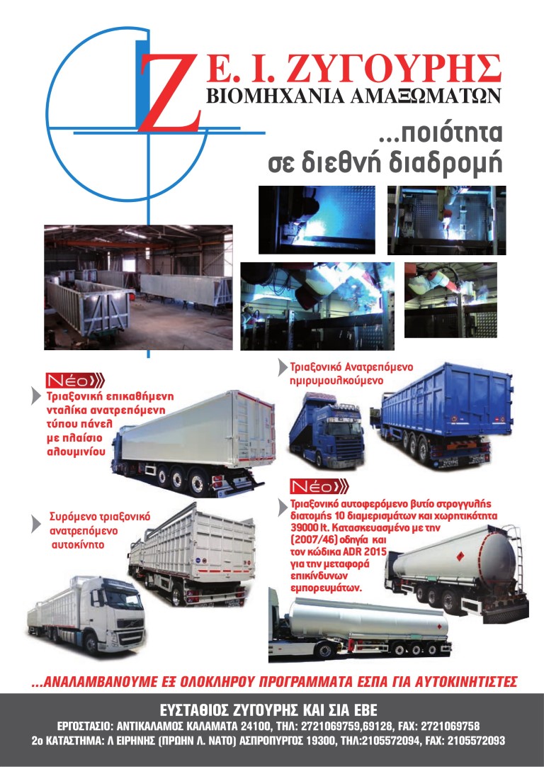 Η εταιρία Ε.Ι. ΖΥΓΟΥΡΗΣ ,δραστηριοποιείται στον κλάδο της κατασκευής αμαξωμάτων από το 1935.Εδρεύει στην Καλαμάτα ,σε ιδιόκτητο χώρο επιφάνειας 15.000 τ.μ. , διαθέτει σύγχρονο μηχανολογικό εξοπλισμό και στελεχώνεται από εμπειρότατο και ειδικά εκπαιδευμένο τεχνικό προσωπικό, ενώ παράλληλα εφαρμόζει Σύστημα Διασφάλισης Ποιότητας πιστοποιημένο κατά ISO 9001:2000.