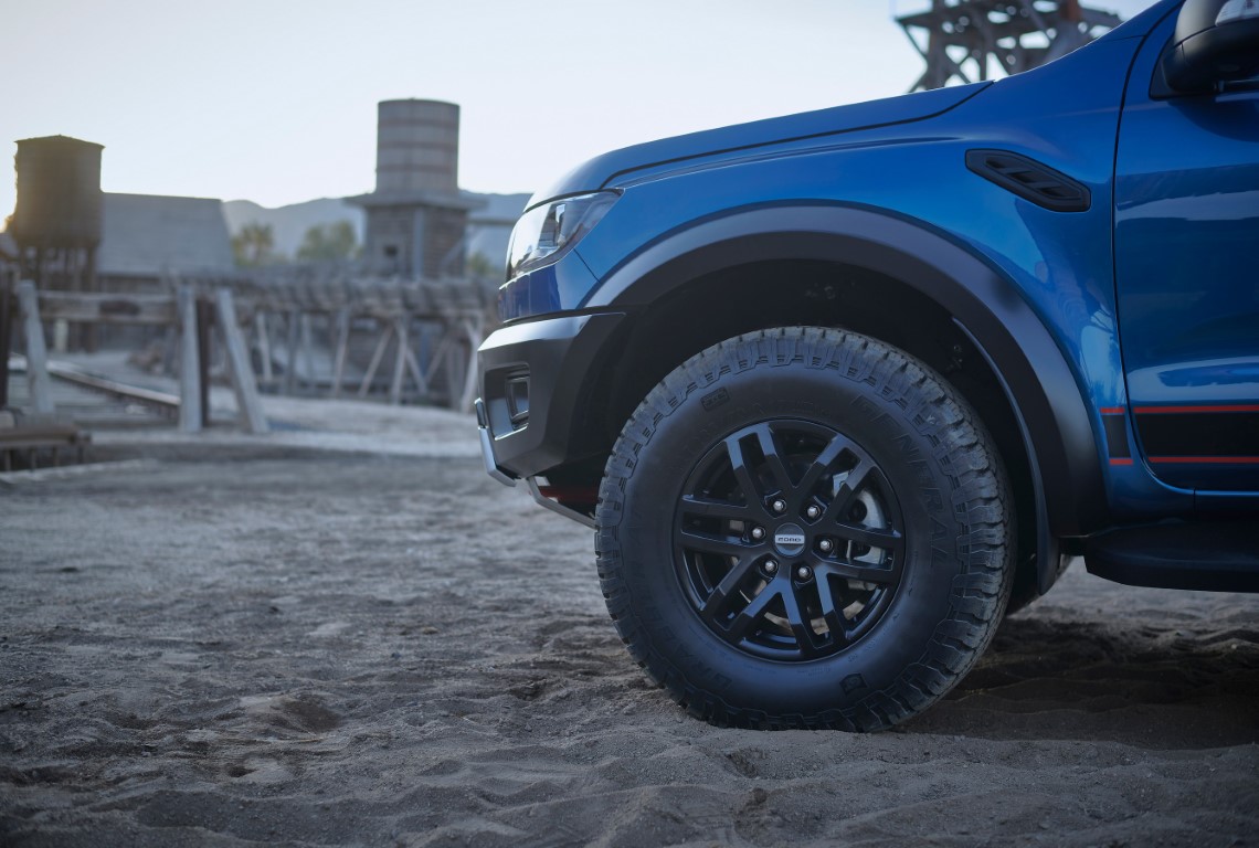 Συμπληρώνοντας τις εντυπωσιακές αγωνιστικές λωρίδες, οι εμπρόσθιοι γάντζοι ρυμούλκησης έχουν κόκκινο φινίρισμα, ενώ τα προτεταμένα τόξα των θόλων των τροχών, οι εμπρός και πίσω προφυλακτήρες, οι χειρολαβές των θυρών και η χαρακτηριστική μάσκα όπου αναγράφεται η λέξη Ford υιοθετούν matte black φινίρισμα για μία ακόμα πιο εντυπωσιακή εμφάνιση συγκριτικά με τις γκρι εξωτερικές λεπτομέρειες της βασικής έκδοσης του Ranger Raptor.