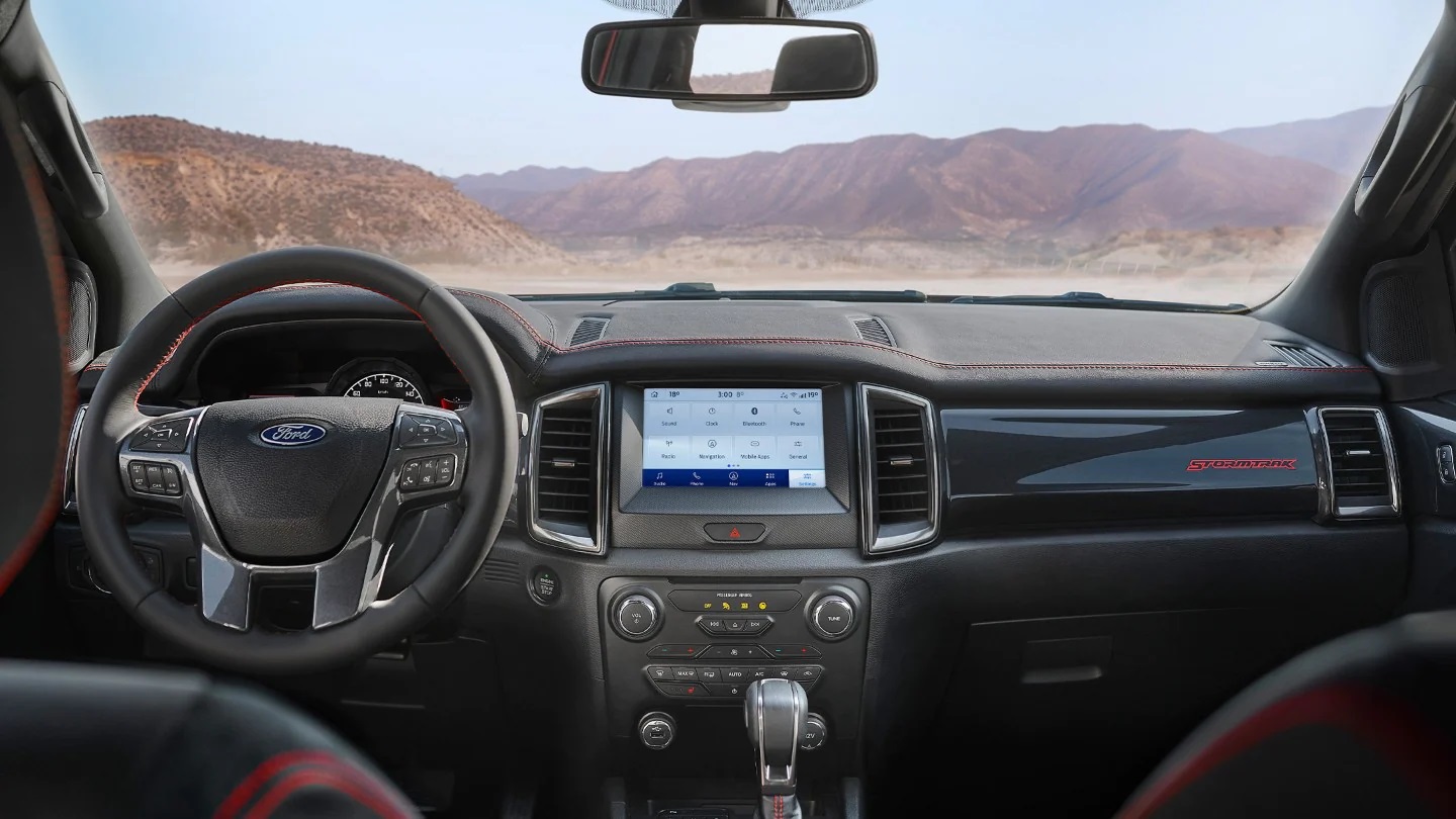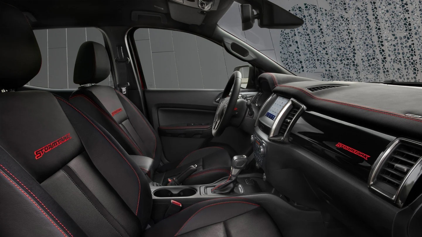 Ό,τι κι αν συμβαίνει έξω, μέσα στο περιβάλλον του Ranger Stormtrak όλα κυλούν ήρεμα, άνετα και υπό έλεγχο. Οι πολυτελείς εσωτερικές λεπτομέρειες σάς βοηθούν να αισθάνεστε σαν στο σπίτι σας. Τα ποιοτικά δερμάτινα καθίσματα με κόκκινες ραφές, τα προστατευτικά μαρσπιέ στις εμπρός πόρτες και τα αποκλειστικά διακριτικά αυτοκόλλητα Stormtrak κάνουν το όχημα σας να ξεχωρίζει στο δρόμο. Το όχημα διατίθεται με επιβλητική θέση οδήγησης και ένα πλήθος τεχνολογικών συστημάτων για άνεση και ευκολία στην οδήγηση: έγχρωμη οθόνη αφής 8″, σύστημα πλοήγησης, αναγνώριση σημάτων οδικής κυκλοφορίας και κάμερα οπισθοπορείας. Επιπροσθέτως, το ενσωματωμένο modem με την υπηρεσία FordPass Connect σάς κρατάει σε επαφή με τον έξω κόσμο.