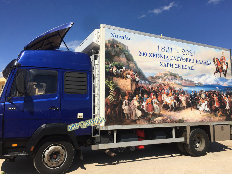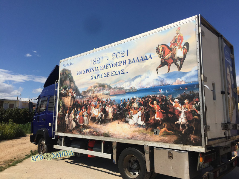Εντυπωσίασε ο πρόεδρος της κοινότητας Δρεπάνου Ναυπλίου, Σωκράτης Δωρής με την πρωτοβουλία του να ντύσει το φορτηγό του με τους ήρωες του ’21 για να γιορτάσει τα 200 χρόνια.