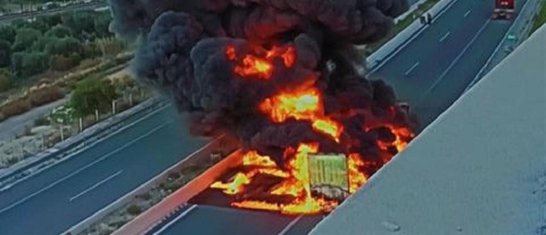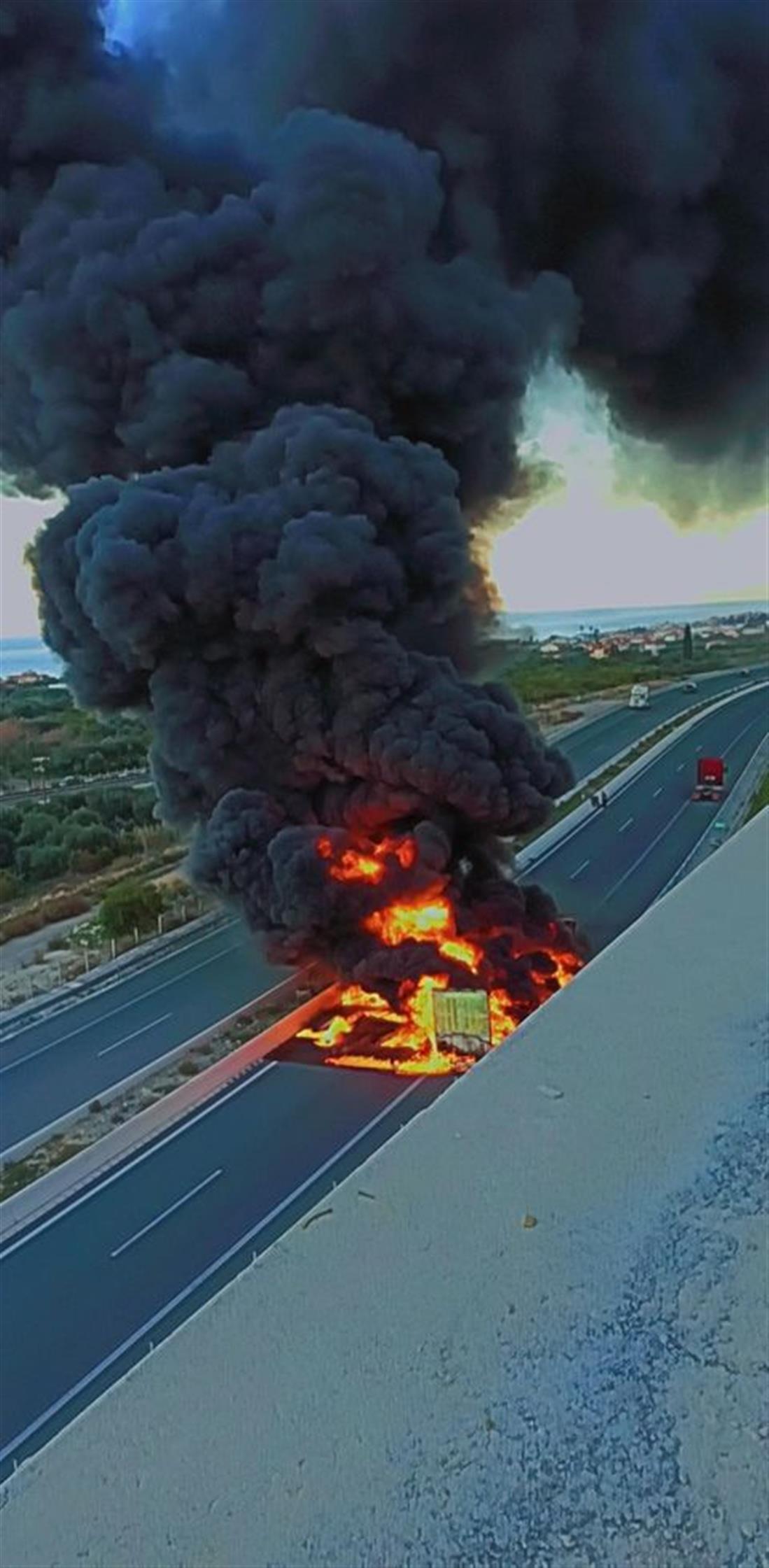Συγκλονιστικές εικόνες από μεγάλη φωτιά σε φορτηγό εν κινήσει, το απόγευμα της Τετάρτης, στην Εθνική Οδό Κορίνθου – Πατρών, στο Καμάρι Κορινθίας.