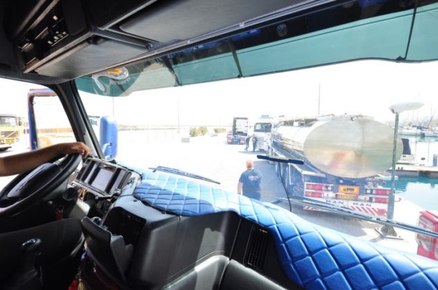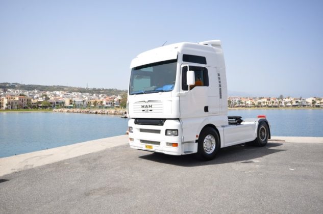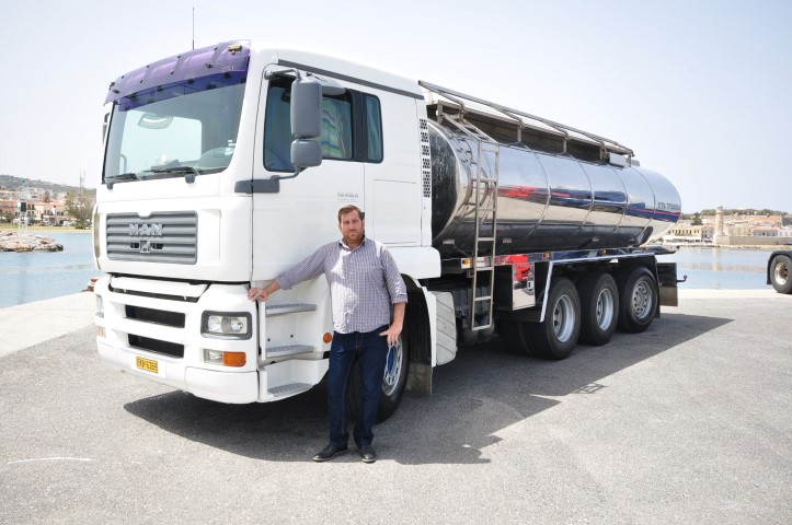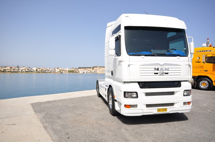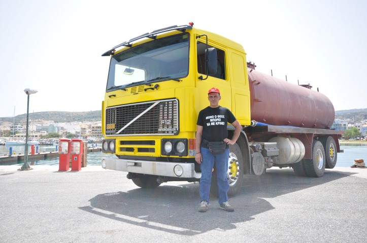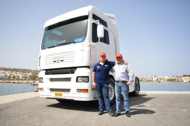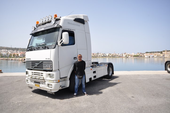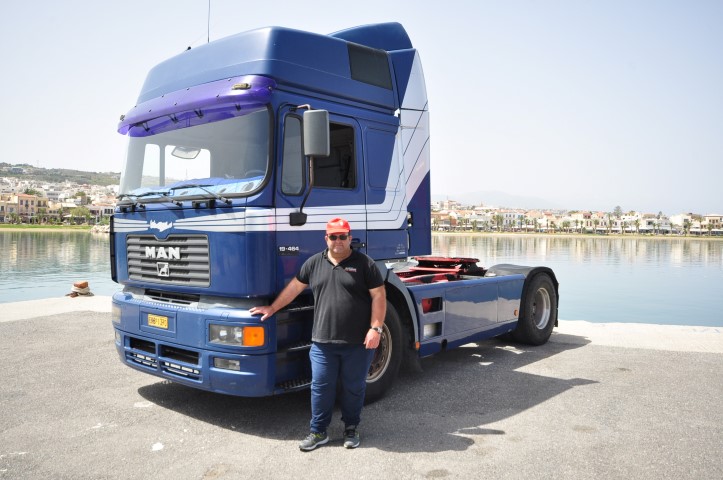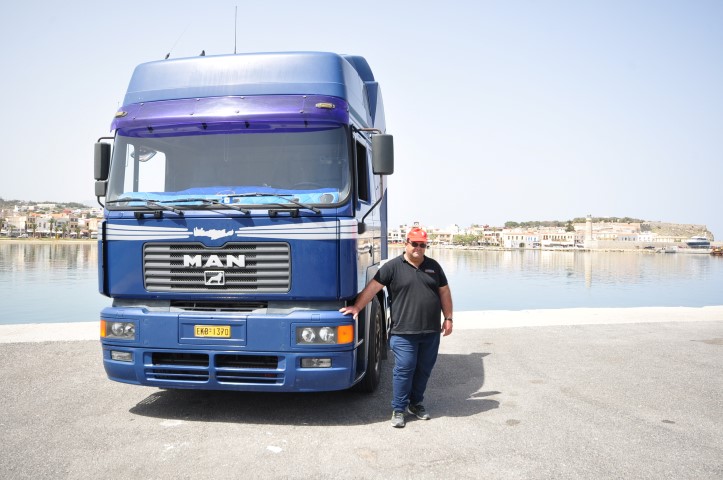 Ο Μανώλης Βαρούχας είναι 36 ετών, παντρεμένος με 2 παιδιά. Στο λιμάνι του Ρεθύμνου τον συναντήσαμε με ένα ΜΑΝ TGA 410 του 2002, ένα από τα τρία επαγγελματικά οχήματα που έχει με τον αδερφό του. Τα δυο αδέλφια έχουν ακόμα δυο χωματουργικά, ένα VOLVO FH και ένα MAN 8Χ4, και μεταφέρουν υγρά, τρόφιμα, ζωοτροφές κ.α.