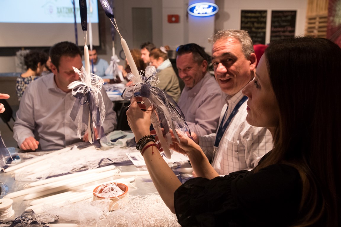 Οι εργαζόμενοι της Ford στην Ελλάδα συγκεντρώθηκαν για καλό σκοπό εκείνο το απόγευμα. Στόχος ήταν να συνεργαστούν δυναμικά για την παραγωγή Πασχαλινών Λαμπάδων, ως προσφορά αγάπης για τα παιδιά που φιλοξενούνται στο Χατζηκυριάκειο Ίδρυμα. Θα ήταν πιο εύκολο να αγοραστούν και να μη «ασχοληθεί» κανένας, όμως ο στόχος εκτός από την προσφορά ήταν και το δημιουργικό κομμάτι, όπως και η σύσφιξη των σχέσεων μεταξύ των εργαζομένων. Για το λόγο αυτό επιστρατεύτηκε η παλιά συνάδερφος στη Ford, η Στέλλα Δερτιμάνη που εδώ και αρκετά χρόνια έχει ειδικευτεί στην παραγωγή χειροποίητων κατασκευών.