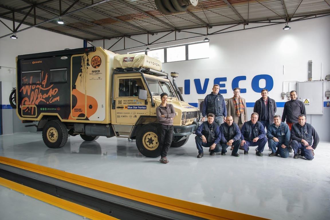Το IVECO VM90 της αποστολής «TheWorldOffroad» φιλοξενήθηκε για μία εβδομάδα στο κεντρικό συνεργείο της Παύλος Ι. Κοντέλλης Α.Ε.Β.Ε. στην Αθήνα, για εξονυχιστικό, πλήρη έλεγχο και για περιοδική συντήρηση, που περιλάμβανε προληπτική αντικατάσταση ιμάντων, λιπαντικών και φίλτρων κινητήρα, καθώς και βαλβολίνων στο κιβώτιο και στο σύστημα μετάδοσης. Επίσης, ο κινητήρας λύθηκε τελείως, ελέγχθηκε σε βάθος και συναρμολογήθηκε, αφού αντικαταστάθηκαν προληπτικά τα κουζινέτα στροφάλου, ο ιμάντας χρονισμού και μία τσιμούχα του μπλοκ που παρουσίασε μικρή διαρροή. Τέλος, αντικαταστάθηκαν μπαλάκια και σινεμπλόκ, στην μπροστινή ανάρτηση τα ημιαξόνια και τα υλικά τριβής στα φρένα.