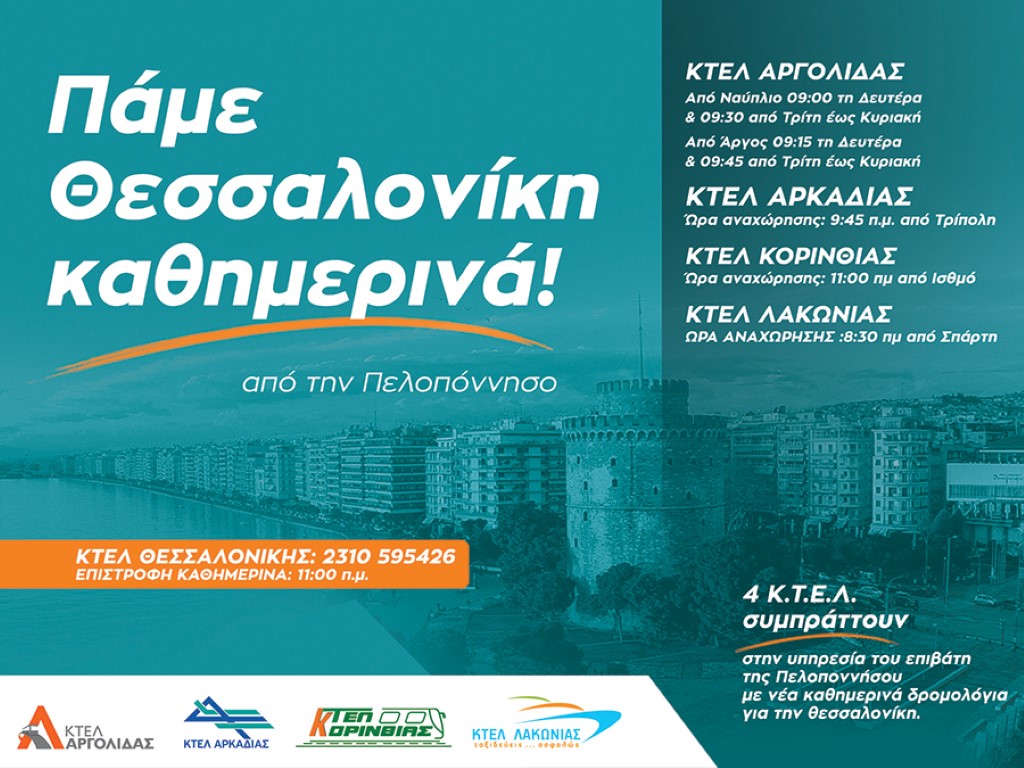 Από τη Σύμπραξη – Συνεργασία ΚΤΕΛ Περιφέρειας Πελοποννήσου γίνεται γνωστό στο επιβατικό κοινό Αργολίδας, Αρκαδίας, Κορινθίας και Λακωνίας ότι απο τη Δευτέρα 11 Φεβρουαρίου, ξεκίνησε η νέα καθημερινή υπεραστική γραμμή Πελοπόννησος – Θεσσαλονίκη.