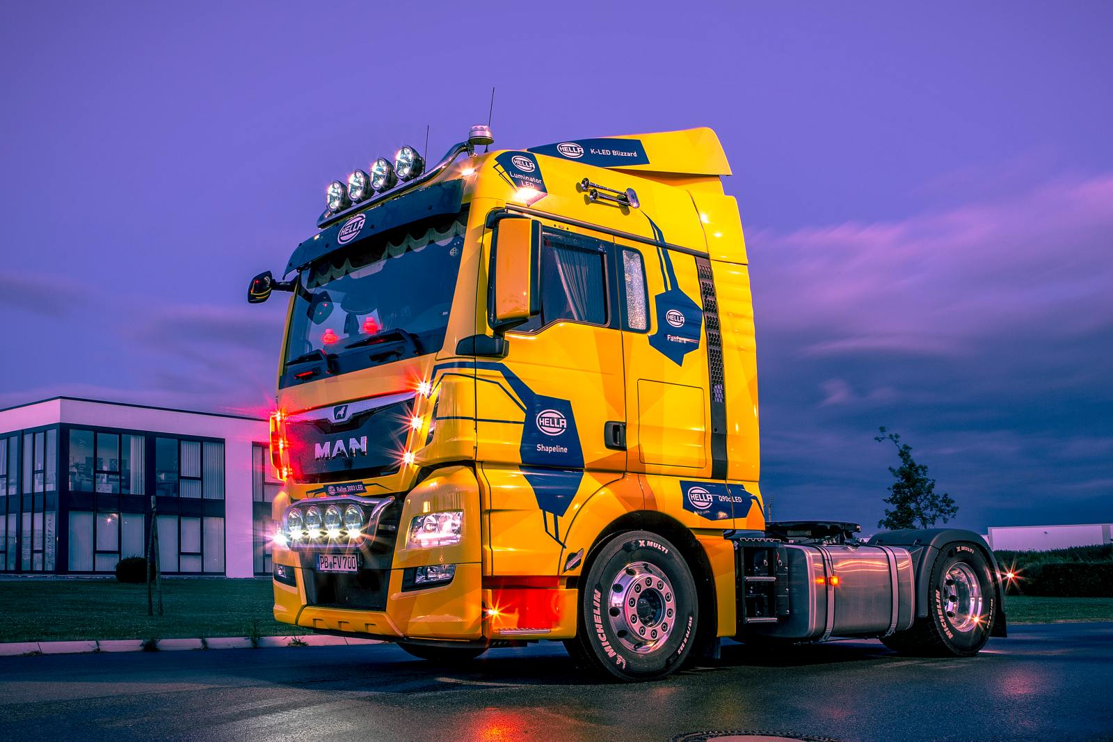 Το φορτηγό εντυπωσιάζει από απόσταση: η καμπίνα οδηγού ανάβει με το κίτρινο χρώμα της HELLA. Ένα σημαντικό στοιχείο είναι οι λαμπτήρες Shapeline, οι οποίοι δίνουν στο όχημα μοναδική εμφάνιση. Με αυτή σειρά λαμπτήρων, τα συστήματα φωτισμού μπορούν να συναρμολογηθούν σύμφωνα με τις εκάστοτε απαιτήσεις. Για το σκοπό αυτό διατίθενται δύο παραλλαγές ─ Tech και Style ─. Ο φωτισμός του TGX υιοθετεί τη παραλλαγή Style. Στο πίσω μέρος, οι λαμπτήρες ενσωματώνουν το πίσω φως θέσης, φως για την όπισθεν και  φως ομίχλης. Συνολικά έχουν εγκατασταθεί έξι  modules για το σκοπό αυτό. Αυτό δημιουργεί ενα μοναδικό  φωτιστικό αποτέλεσμα.
