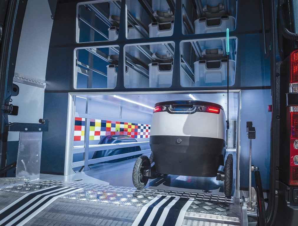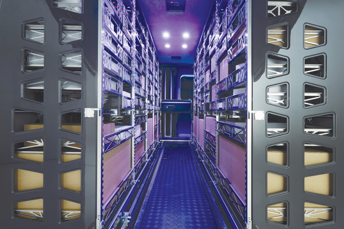 Καινοτόμοι αλγόριθμοι ελέγχουν την συλλογή των παραγγελιών, την φόρτωση του εμπορεύματος, την διαχείριση του χώρου φόρτωσης και τον σχεδιασμό της διαδρομής. Το…όραμα για το βαν του μέλλοντος είναι τόσο προχωρημένο που ο σχεδιασμός του αυτοματοποιημένου χώρου φόρτωσης προβλέπει ακόμα και την χρήση drones για παράδοση προϊόντων από αέρος. Το βαν μπορεί να εφοδιαστεί με δύο drones, ωφέλιμου φορτίου 2 κιλών το καθένα και με ακτίνα παράδοσης 10 χιλιομέτρων. Οι ειδικοί υπολογίζουν πως η παραπάνω, νέα διαδικασία θα επιτρέψει την αύξηση της παραγωγικότητας έως και 50% σε υπηρεσίες παράδοσης μικρής ακτίνας δρομολογίων.
