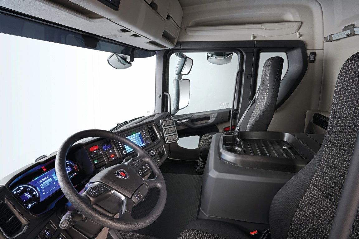 Η επανασχεδίαση του ταμπλό και οι δυνατότητες ρύθμισης των καθισμάτων προάγουν την εργονομία, την ευρυχωρία και το εύκολο πέρασμα του οδηγού προς τα δεξιά και προς την κουκέτα του. Σε όλες τις καμπίνες της νέας γενιάς φορτηγών Scania, η θέση οδήγησης έχει μετακινηθεί κατά 65 χιλιοστά πιο κοντά στο παρμπρίζ και κατά 20 χιλιοστά πιο κοντά στην πόρτα. Σύμφωνα με τον κατασκευαστή, αυτή η αλλαγή βελτιώνει την ασφάλεια, την ορατότητα και τους διαθέσιμους χώρους του οδηγού. Την ορατότητα βελτιώνουν επίσης οι μεγαλύτερες γυάλινες επιφάνειες, τα λεπτότερα πάνελς των θυρών και η επανασχεδίαση των κολόνων τύπου Α.