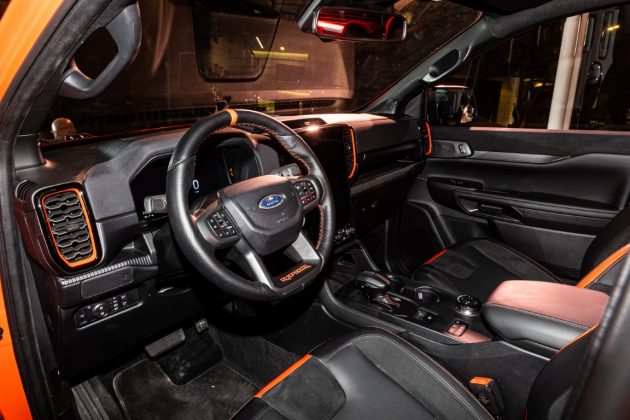 Η καμπίνα του Ranger Raptor είναι εκφραστική όσο το εξωτερικό του, με τις Code Orange πινελιές της Ford Performance να απαντώνται σε πολλά σημεία. Το άνω τμήμα του ταμπλό και των πάνελ των θυρών φέρουν επένδυση Terra Suede, η οποία είναι μαλακή και ταυτόχρονα ανθεκτική και εύκολη στο καθάρισμα, με ματ φινίρισμα που μειώνει τις αντανακλάσεις και τονίζει την αίσθηση πολυτέλειας και επιδόσεων που αποπνέει το εσωτερικό.