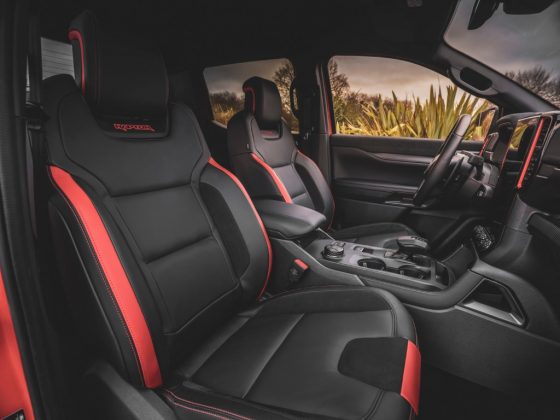 Μοναδικά για το Ranger Raptor, τα εμπνευσμένα από μαχητικά αεροσκάφη καθίσματα Ford Performance διαθέτουν ενισχυμένα πλαϊνά μαξιλάρια και είναι σχεδιασμένα για να συγκρατούν τους επιβάτες στη θέση τους σε όλα τα είδη εδαφών. Τα υλικά των καθισμάτων έχουν εξελιχθεί για να εξυπηρετούν λειτουργικούς και αισθητικούς σκοπούς με μία νέα «super matte» επένδυση που αναδεικνύεται περαιτέρω με τη χρήση suede. Με κάθε Ranger Raptor να διατίθεται ως διπλοκάμπινο, τα πίσω καθίσματα έχουν σχεδιαστεί ώστε να συγκρατούν και να υποστηρίζουν το σώμα των επιβατών όπως και τα εμπρός.