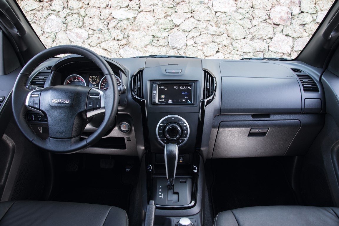 Ακόμα πιο εντυπωσιακή είναι η προσπάθεια στο εσωτερικό της καμπίνας. Από την πολύ μοντέρνα και ιδιαίτερη σχεδίαση, μέχρι τον εξοπλισμό αλλά και την πολύ μεγάλη διαθεσιμότητα σε χώρους για τους επιβάτες, το D-Max κερδίζει τις εντυπώσεις. Υπάρχουν δεκάδες σημεία στα οποία θα μπορούσε να σταθεί κανείς (όπως για παράδειγμα ο νέος, πανέμορφος πίνακας οργάνων) ενώ και η λίστα του εξοπλισμού είναι μεγάλη και -στην περίπτωση του διπλοκάμπινου- αντίστοιχη ενός ακριβού επιβατικού τετρακίνητου. Αναμφισβήτητα η Isuzu δημιούργησε ένα σαλόνι που πραγματικά χαίρεσαι να βλέπεις και να ζεις μαζί του, με έμφαση στην άνεση και την πολυτέλεια. Οι χώροι, ανεξαρτήτως έκδοσης αμαξώματος, είναι από τους μεγαλύτερους που διατίθενται σε αυτοκίνητο της κατηγορίας, κάτι που ισχύει κυρίως για τους πίσω επιβάτες της τετράθυρης έκδοσης. Τα πίσω καθίσματα της τελευταίας μπορούν να αναδιπλωθούν σε διάφορες θέσεις αυξάνοντας ακόμα περισσότερο την πρακτικότητα του αυτοκινήτου. Νέο στοιχείο αποτελεί και ένα σύστημα πολυμέσων από την Pioneer (με χειριστήρια στο τιμόνι), με εργοστασιακή κάμερα οπισθοπορείας ενώ υπάρχουν και νέες θύρες φόρτισης USB, δύο νέα ηχεία οροφής, νέου τύπου επενδύσεις στα καθίσματα και μαλακές επενδύσεις στα υποβραχιόνια.