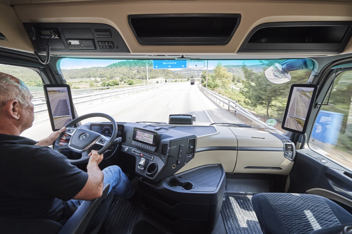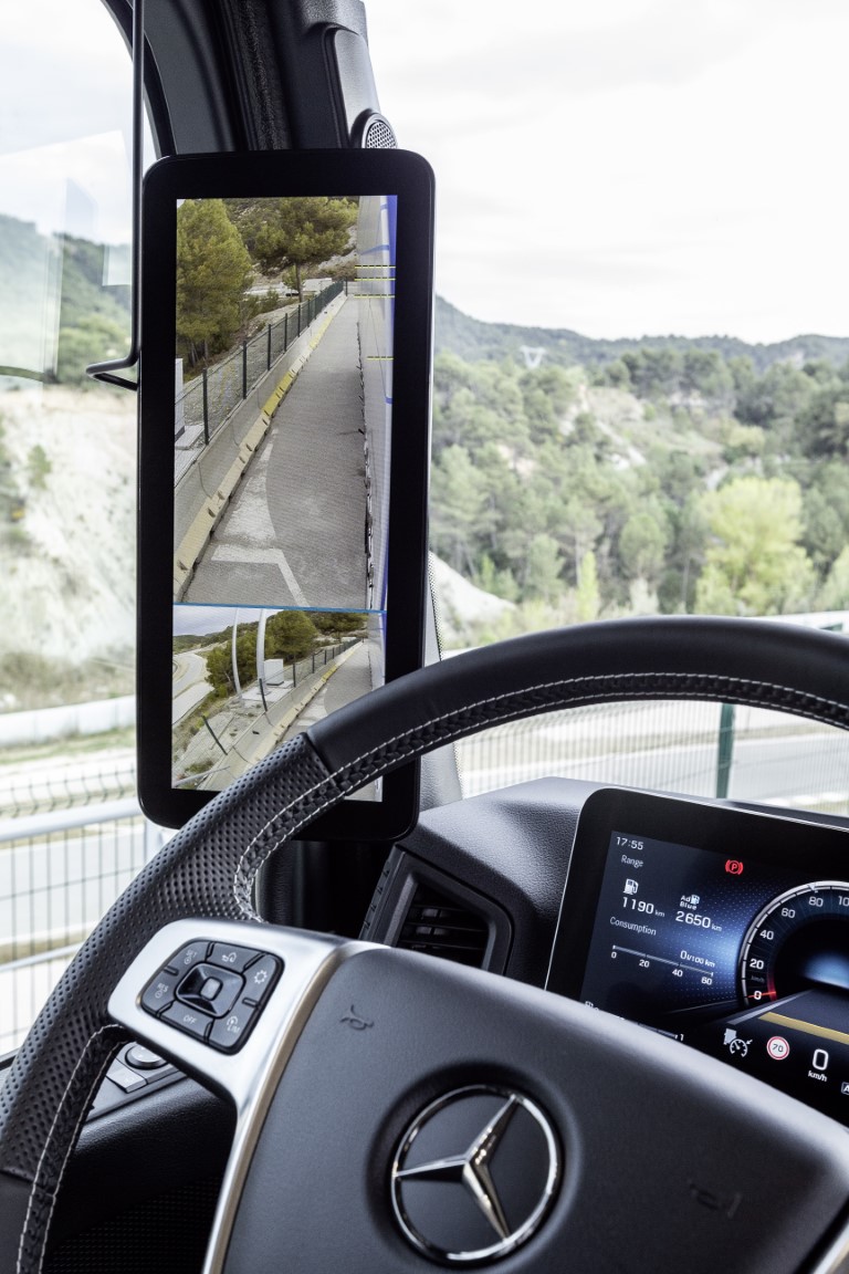 Αυτό που συναντούσαμε κάποτε σε μελλοντικά σχέδια φορτηγών, το νέο Actros το συμπεριλαμβάνει στον εξοπλισμό του και πρωτοπορεί για ακόμα μια φορά. Πιο συγκεκριμένα, οι κύριοι και οι ευρυγώνιοι καθρέφτες αντικαταστάθηκαν στο νέο Actros με το MirrorCam ως μέρος του βασικού εξοπλισμού, για πρώτη φορά σε φορτηγό μαζικής παραγωγής. Αυτό το σύστημα παρέχει σημαντικά βελτιωμένη περιμετρική ορατότητα και αποτελείται από δύο κάμερες τοποθετημένες στο εξωτερικό του οχήματος και δύο οθόνες 15 ιντσών (με ανάλυση 720 x 1920 pixel) στις κολώνες A μέσα στην καμπίνα. Τα οφέλη στην ορατότητα είναι αυτονόητα, καθώς το οπτικό πεδίο που «έκρυβαν» οι εξωτερικοί καθρέπτες είναι τώρα περισσότερο διευρυμένο. Επιπρόσθετα, το MirrorCam παρέχει πολλές άλλες λειτουργίες. Στις οθόνες, η εικόνα εμφανίζεται διαιρεμένη, σαν να κοιτάει κανείς συμβατικούς καθρέπτες, στις στροφές υπάρχει πλήρη θέαση του τρέιλερ ενώ ψηφιακές γραμμές απόστασης συμβάλλουν στην σαφέστερη εκτίμηση της απόστασης των οχημάτων που ακολουθούν. Μια επιπλέον γραμμή μπορεί να ρυθμιστεί ξεχωριστά ώστε να δείχνει το τέλος του ρυμουλκούμενου, κάτι που διευκολύνει τους χειρισμούς ακριβείας.