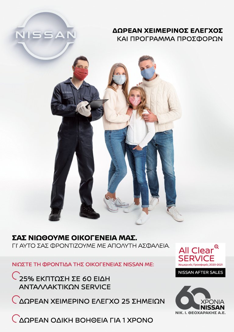 Με κεντρικό σύνθημα «Σας νιώθουμε οικογένειά μας. Γι’ αυτό σας φροντίζουμε με απόλυτη ασφάλεια», η Nissan θέλει να τονίσει, μέσω του χειμερινού προγράμματος προσφορών All Clear Service, την σπουδαιότητα της υγιεινής και της ασφάλειας και στο After Sales Service, εν όψει της πανδημίας Covid-19 στην χώρα μας.