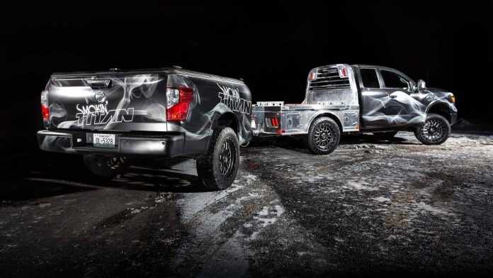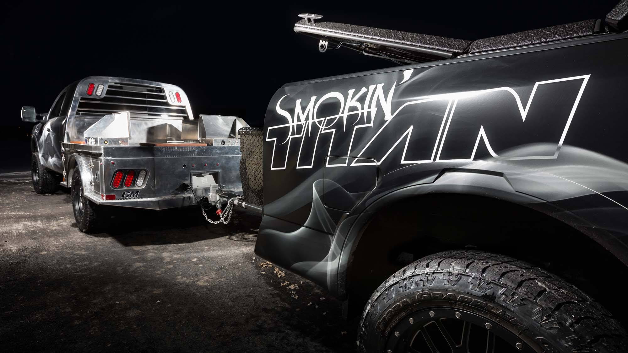 Ωστόσο, η “καρδιά” του Smokin ‘TITAN βρίσκεται μέσα στο ρυμουλκούμενο που έλκει το φορτηγό. Δεδομένου ότι το ψήσιμο μπορεί να δημιουργήσει θερμότητα που ξεπερνά τους 300 °C, το εργοστασιακό πάτωμα του TITAN XD αφαιρέθηκε από το πλαίσιο και χρησιμοποιήθηκε μια ιδιοκατασκευή της B & S, προκειμένου να αποφευχθεί η επίδραση της θερμότητας στο φορτηγό. Το ρυμουλκούμενο του Smokin ‘TITAN διαθέτει δύο γνήσιες, στεγανές θήκες αποθήκευσης του Nissan TITAN που χρησιμεύουν για τα ξύλα της φωτιάς. Χρησιμοποιώντας το πρωτοποριακό σύστημα μεταφοράς Utili-Track του TITAN, ένας συρόμενος δίσκος της B & S έχει σχεδιαστεί για να είναι εύκολο να συρθεί η ψησταριά μέσα και έξω από το πάτωμα. Το ρυμουλκούμενο είναι ασφαλισμένο με ένα χαλύβδινο κάλυμμα Diamondback SE Tonneau, επιτρέποντας στον χρήστη να καπνίζει το κρέας σε μια ειδική θύρα και να το συσκευάζει για το ταξίδι.
