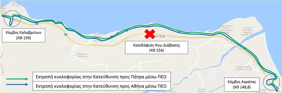 Ολιγόωρες κυκλοφοριακές ρυθμίσεις θα ισχύσουν στη ΝΕΟ Κορίνθου-Πατρών από τις 16:00 το απόγευμα της Τετάρτης 14/12 έως τις 06:00 το πρωί της επόμενης μέρας, κατά τη διάρκεια των οποίων θα διακοπεί προσωρινά η κυκλοφορία και των δύο κατευθύνσεων μεταξύ των κόμβων Ακράτας (ΧΘ 148,8) και Καλαβρύτων (ΧΘ 159,0) στη Νέα Εθνική Οδό Κορίνθου-Πατρών και θα εξυπηρετείται μέσω παράκαμψης από την Παλαιά Εθνική Οδό, όπως φαίνεται στο ακόλουθο σχηματικό διάγραμμα.