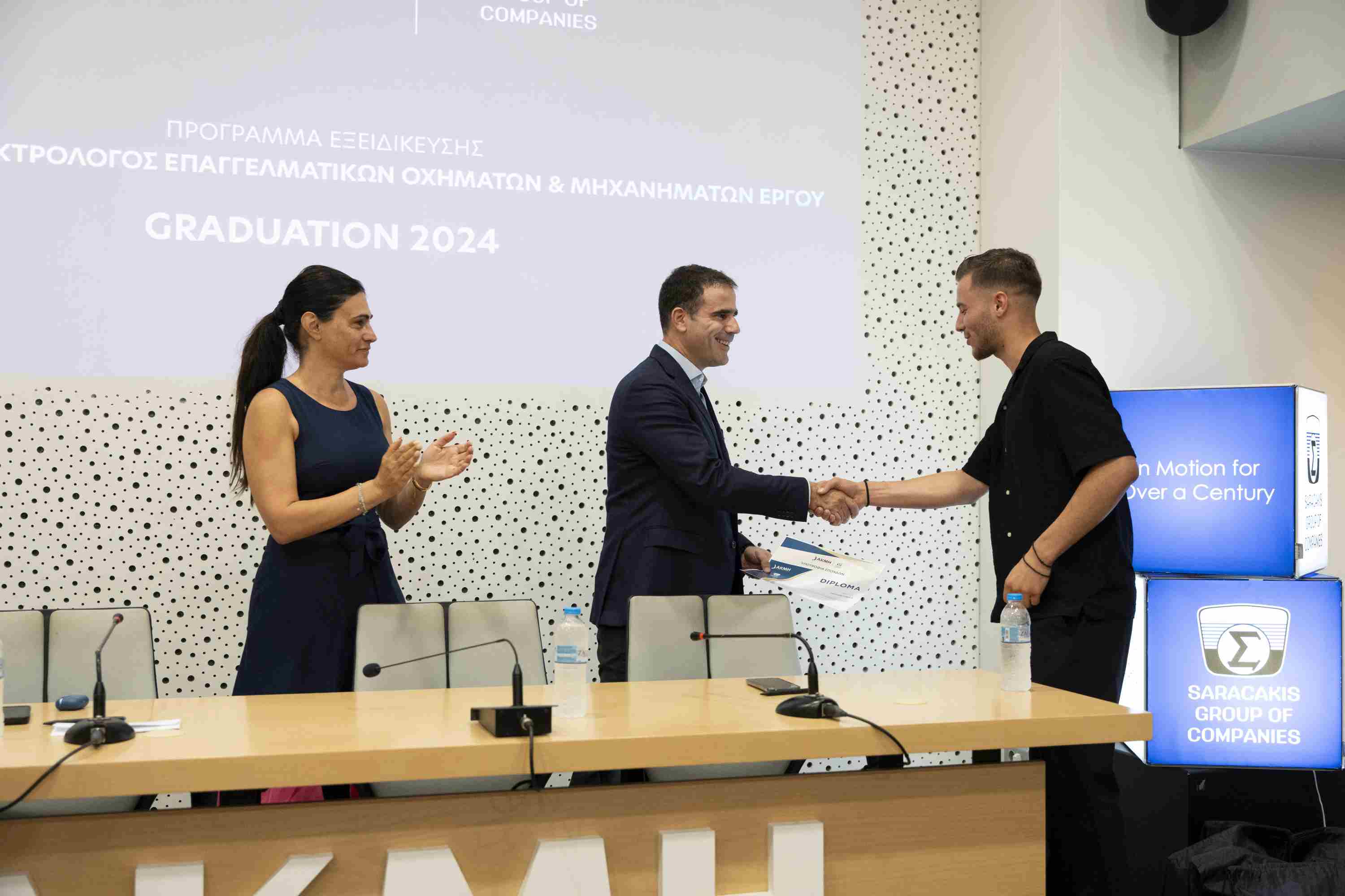 Στην Τελετή Αποφοίτησης το «παρών» έδωσαν στελέχη των δύο οργανισμών ενώ ο Διευθύνων Σύμβουλος του Ομίλου Επιχειρήσεων Σαρακάκη, Αλέξανδρος Δ. Σαρακάκης απένειμε τα Διπλώματα στους αποφοίτους και απέδωσε την υποτροφία στον απόφοιτο που αρίστευσε.