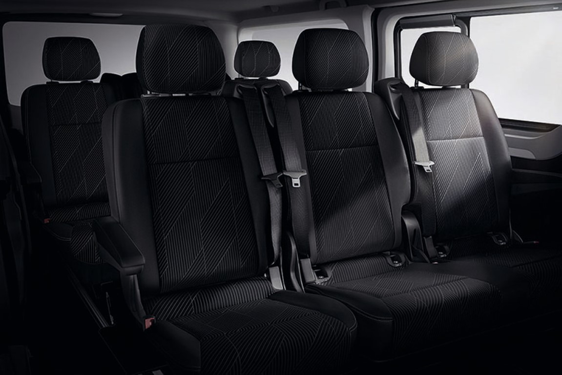 Οι πλούσιοι χώροι για τον οδηγό και τους επιβάτες συνδυάζονται με εξίσου πλούσιο εξοπλισμό άνεσης και ασφάλειας που περιλαμβάνει όλες τις ηλεκτρικές – ηλεκτρονικές ευκολίες, αλλά και ζώνες 3 σημείων για όλους τους επιβάτες. Οι επιβάτες των δύο πίσω σειρών εκτός από την ιδιαίτερα εύκολη πρόσβαση, λόγω της μεγάλης πλαϊνής πόρτας μήκους 1.030χλστ., έχουν στη διάθεση τους και ανεξάρτητη ρύθμιση για τον κλιματισμό, ένα χαρακτηριστικό πολύ χρήσιμο ιδιαίτερα κατά τους καλοκαιρινούς μήνες. Παράλληλα το 9θεσιο Renault Trafic είναι διαθέσιμο τόσο με το σύστημα πλοήγησης Media Nav Evo, όσο και 2η πλαϊνή πόρτα.