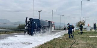 Ανατροπή βυτιοφόρου της Π.Α. στην Eθνική Αθηνών – Κορίνθου