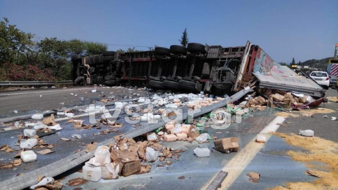 Νταλίκα που μετέφερε σαμπουάν, αφρόλουτρα και άλλα είδη προσωπικής υγιεινής, εξετράπη της πορείας της και πέρασε στο αντίθετο ρεύμα, το μεσημέρι της Δευτέρας (11/06), σε τροχαίο ατύχημα που σημειώθηκε στο 164ο χλμ. της Εθνικής Οδού Αθηνών – Λαμίας.