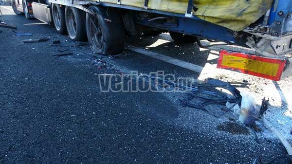 Η σύγκρουση ήταν σφοδρή και όπως μαρτυρούν και οι σοκαριστικές εικόνες, το Ι.Χ. φαίνεται να «πέρασε» κάτω από την πίσω πλευρά του φορτηγού με αποτέλεσμα να μετατραπεί σε μια άμορφη μάζα από λαμαρίνες, από τις οποίες ο 55χρονος οδηγός κατάφερε ως εκ θαύματος να βγει σώος!