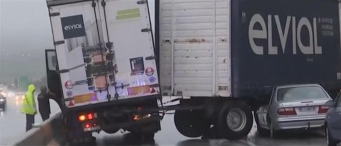 Μία νταλίκα «δίπλωσε» εν μέσω καταρρακτωδούς βροχής, έξω από τη Θεσσαλονίκη, λίγο πριν από την έξοδο για Λαγυνά, στο ρεύμα προς Καβάλα.